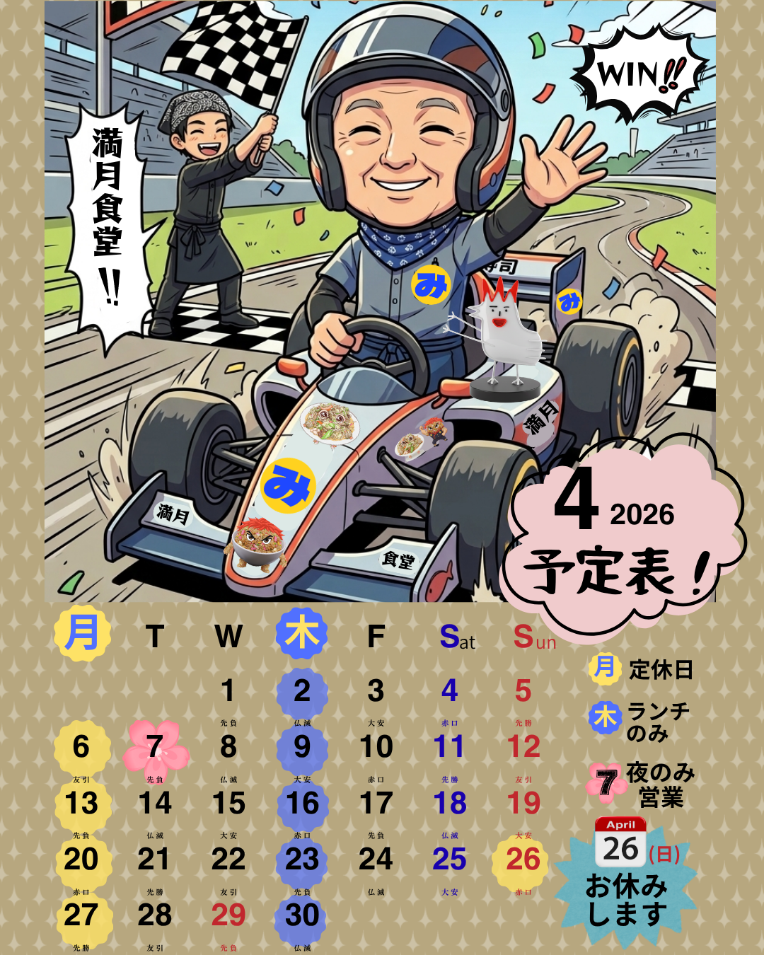 今月は7日(火)、入学式の関係で、夜のみの営業、26日(日)は私用のためお休みとさせていただきます。